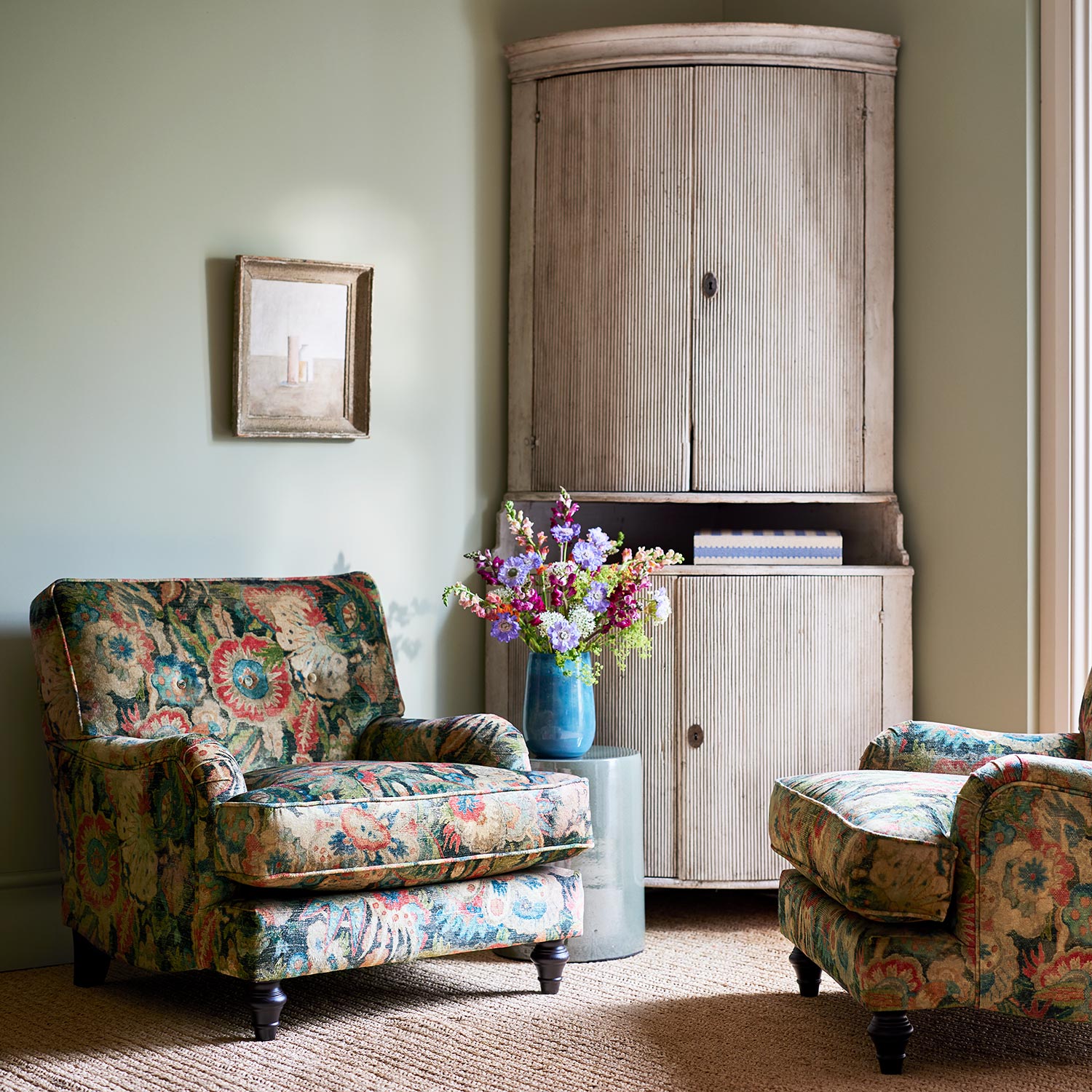 From a French tapestry in the Bizarre style, which was popular in Europe in the late 17th century and featured large, asymmetrical leaves and flowers. This pattern of stylised flowers is true to the hue of the original. A lovely printed velvet fabric, perfect for curtains and upholstery, with a somewhat vintage feel.